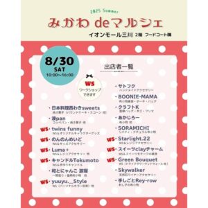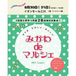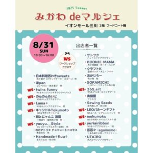 8月30日(土)、8月31日(日)の2日間、イオンモール三川2階フードコート隣で、みかわdeマルシェ2025summerが開催されます。手作り作家28店舗が大集合しますよ。小物やアクセサリーのワークショップも多数!お子さんと一緒に参加してみませんか??