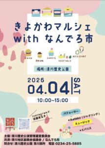 4月4日(土)10時から15時まで、清川歴史公園にて、きよかわマルシェwithなんでろ市が開催されます。キッチンカーやクラフトハンドメイド、体験コーナーと盛りだくさんです!家族で行ってみませんか??