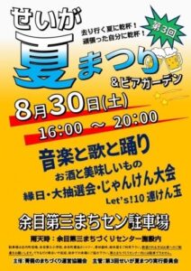 8月30日(土)午後4時から午後8時まで、余目第三まちづくりセンター施設内で、せいが夏まつり&ビアガーデンが開催されます。音楽と歌と踊り、じゃんけん大会や縁日と、親子で楽しめるイベントです!親子で参加してみませんか?