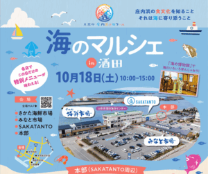 10月18日(土)午前10時から午後3時まで、さかた海鮮市場、SAKATANTO、みなと市場で、海のマルシェin酒田が開催されますサワラの解体ショーや 海の生き物タッチプール、美味しいグルメもたくさんありますよお子さんと一緒に行ってみませんか??
