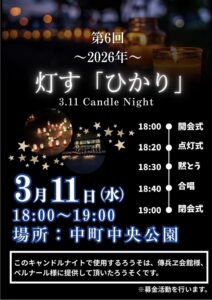 3月11日(水)18時から19時、酒田市中町中央公園にて、灯す「ひかり」キャンドルナイトが行われます。酒田光陵高校ビジネス流通科の生徒さん達による未来の命を守るための募金活動として、震災遺構大川小学校の保存費用を支援する募金も行われます。東日本大震災から15年。お子さんと一緒に、防災について、命を守ることについてを体験しませんか。