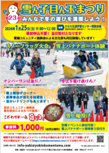 1月25日(日)9時から12時まで、ひらた生涯学習センター特設会場で開催される「雪ん子目ん玉まつり」へ遊びに来ませんか?冬の魅力を存分に楽しむことができる多彩なアクティビティが用意されています!スリル満点のスノーフラッグ大会や、ワクワクする雪上バナナボート体験、そして雪上輪投げコーナーなど、バラエティ豊富な催しがいっぱいですお子さんと一緒に参加して、素敵な冬の思い出を作りませんか?