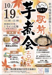 10月19日(日)午前11時から午後3時まで、ミライニ広場にて、駅前芋煮会2025が開催されます庄内地方と内陸地方の芋煮の食べ比べやお子さんが楽しめるクラフト体験もあります親子で行ってみませんか